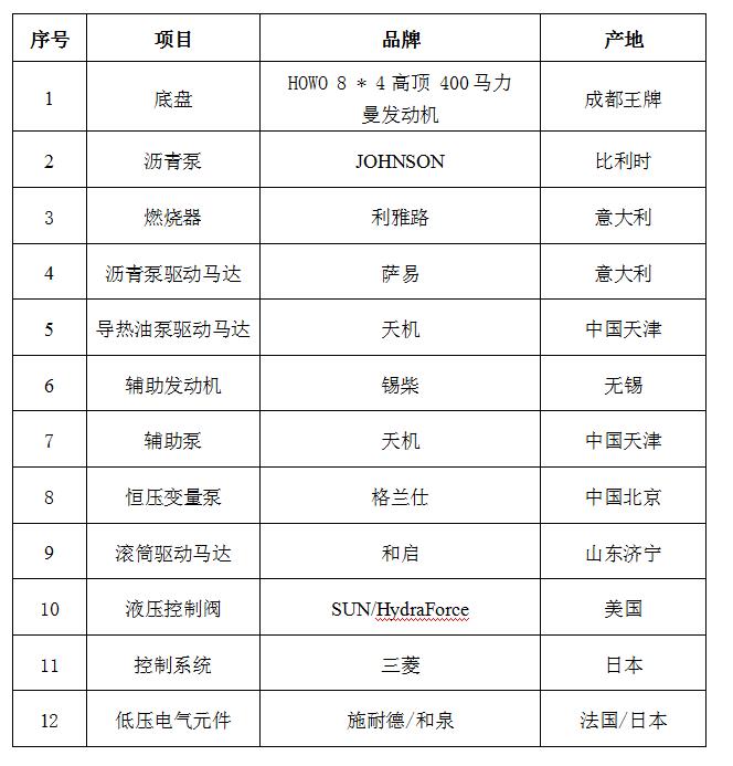 14.整機關鍵部分的零部件(如液壓泵、瀝青泵、導熱油泵、液壓馬達等)均采用進口元件,確保整機的可靠性,提高使用壽命;